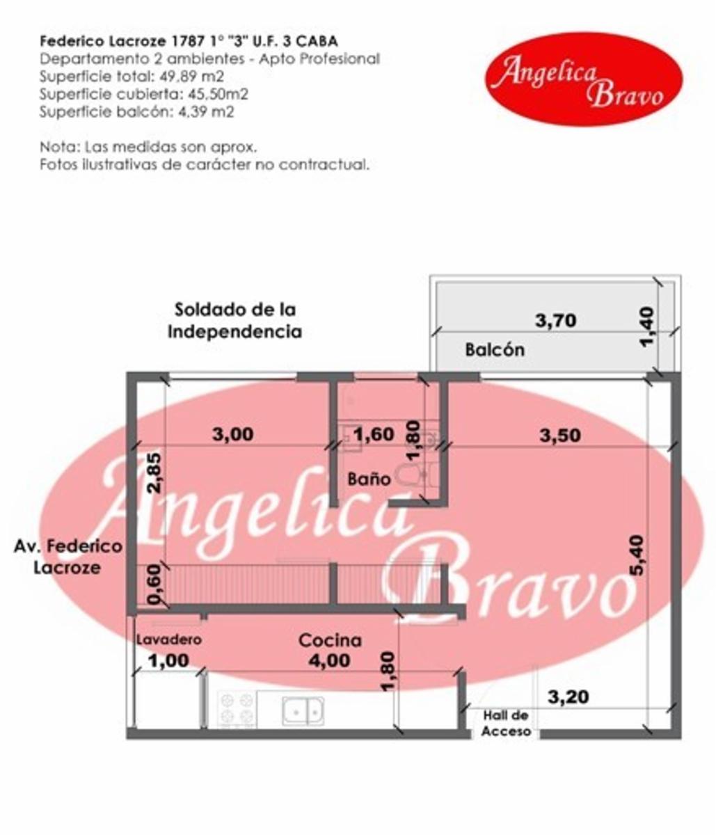 DISPONIBLE VISITAR A PARTIR 20-03-2026 2 Ambientes 50mts - Primer piso frente Excelente departamento pintado blanco, pisos de parquet plastificado Ultimo rubro Estetica Dermatologa - APTO CONSULTORIOS - OFICINAS PROFESIONALES -otros Palermo cañitas/imprenta: esquina de Lacroze 1787 y Soldado de la independencia. VER PLANO DE DISTRIBUCION EN FOTOS Superficie total 49.89m² cubiertos 45.50m² y balcón 4,39m² BALCON a la calle, Orientación Oeste DORMITORIO con ventanas DVH y persianas, amplios placard LAVADERO independiente con secarropas electrico COCINA COMPLETA amplia con ventilación, calefón y cocina con Horno a gas LIVING COMEDOR con salida al balcón, ventana con persianas , A.A. F/C Excelente ubicación a 2 cuadras de libertador y una de Luis María Ocampo. Palermo cañitas/imprenta: esquina de Lacroze 1787 y Soldado de la independencia EDIFICIO: Antigüedad aprox 50 años, encargado permanente c/ vivienda, 8 pisos, 3 dptos x piso, 1 ascensor, Expensas incluye Aysa. Coordinar visitas por whatsapp Angelica Bravo matricula 5096 https://respaldar.com.ar/formulario-express-191-inmobiliaria-760